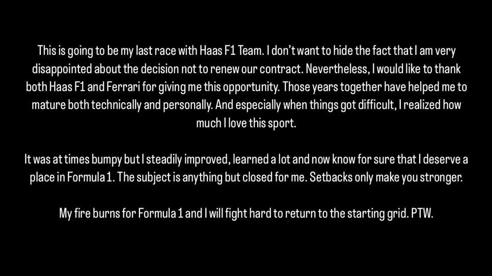 “ This is going to be my last race with Haas F1 team. I don’t want to hide the fact that I am very disappointed about the decision not to renew our contract. Nevertheless, I would like to thank both Haas F1 and Ferrari for giving me this opportunity. those years together have helped me to mature both technically and personally. And especially when things got difficult, I realised how much I love this sport.